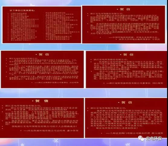 浙江宏電環(huán)保股份有限公司創(chuàng)立,眾多環(huán)保機構(gòu)和企業(yè)發(fā)來了賀電賀信,表示熱烈祝賀,在此一并表示感謝。股份創(chuàng)立藍圖展,乘風破浪再揚帆!宏電,加油?。ㄎ?黃永征 攝影/繆少芬)