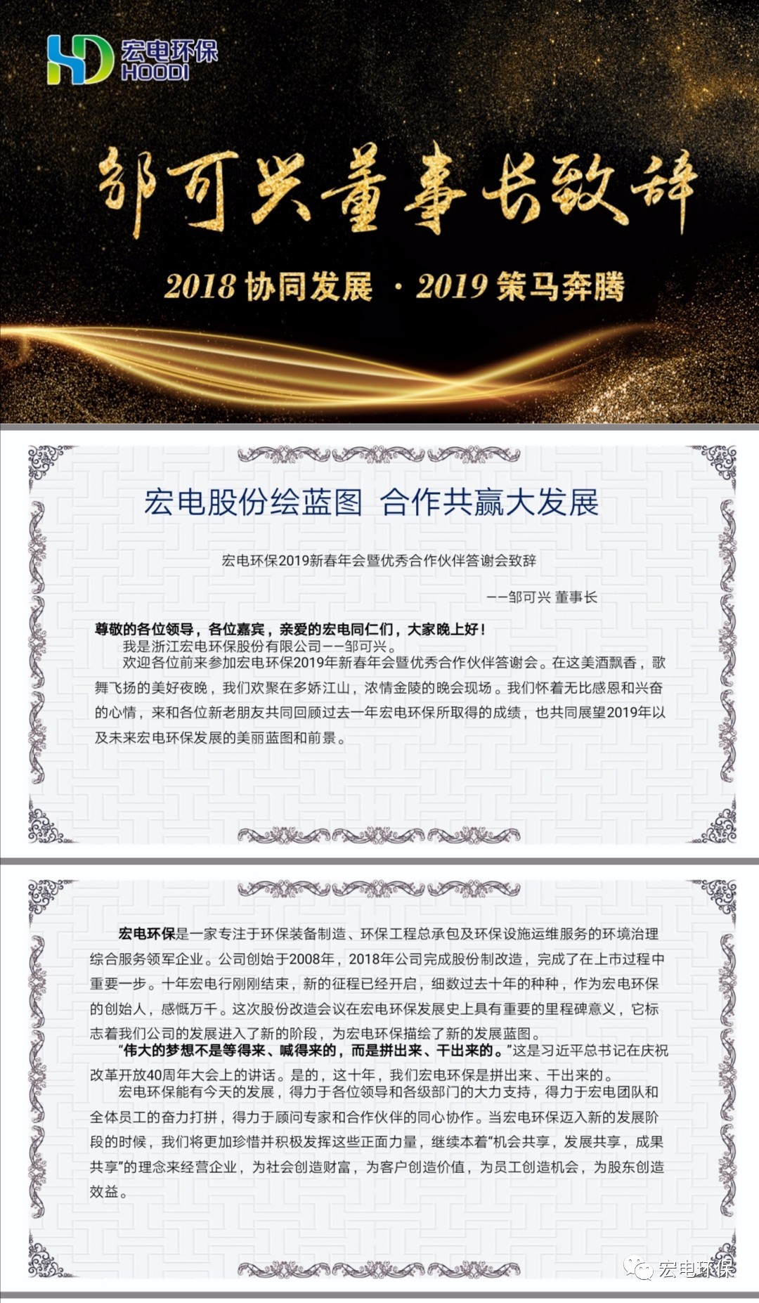 公司董事長(zhǎng)鄒可興發(fā)表了熱情洋溢的以“宏電股份繪藍(lán)圖 ?合作共贏大發(fā)展”為主題的致辭,他對(duì)宏電環(huán)保與合作伙伴在2018年取得的成績(jī)表示肯定,希望2019年再接再厲,策馬奔騰,繼續(xù)合作共贏,并期待與更多熱衷于環(huán)保事業(yè)的合作伙伴進(jìn)行合作,與國(guó)家同頻,與時(shí)代共振,共同推進(jìn)碧水藍(lán)天的宏偉事業(yè)。