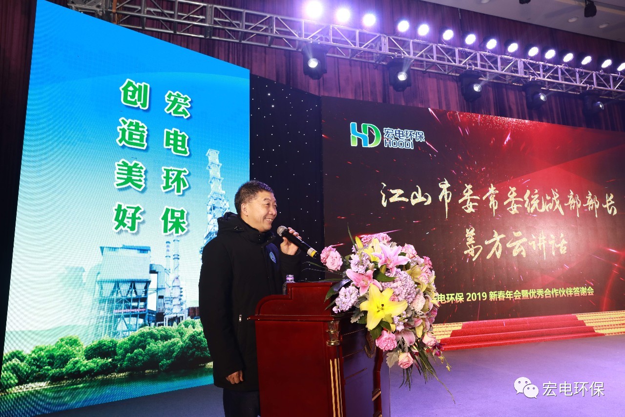 江山市委常委、統(tǒng)戰(zhàn)部部長(zhǎng)姜方云先生蒞會(huì)講話,對(duì)宏電環(huán)保取得的驕人業(yè)績(jī)表示祝賀,歡迎更多的宏電合作伙伴來(lái)江山投資興業(yè)。